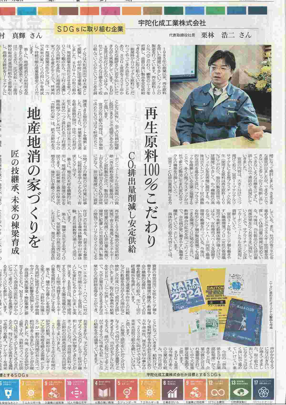 さて、先日朝から「宇陀化成さん新聞載ってましたね」の電話を数件いただきました。